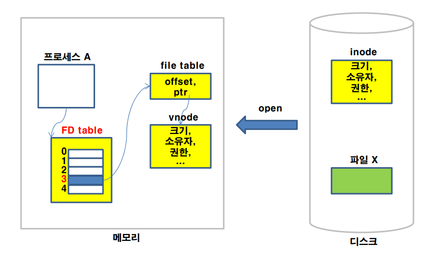 따라서 실제로는 위와같은 구조를 가진다. FD table은 프로세스마다 가지는 파일 디스크립터 테이블로 fd(file descriptor)에 대한 정보를 담고 있으며 file table은 프로세스마다 다르게 가져야하는 파일에 대한 정보(offset, ptr, ...)를 가지고 있다.