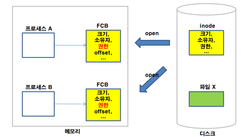 리눅스에서는 프로그램 실행 시, 메모리에 PCB(process control block)를 생성하여 해당 프로세스를 관리한다. 만약 현재 실행 중인 프로세스에서 파일에 접근하여 사용하고자 하면 마찬가지로 FCB(file contrrol block)를 생성하여 사용중인 파일을 관리하도록한다. 앞서 언급된 inode와 같은 metadata가 FCB에 저장된다.