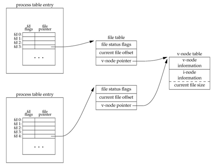 위에서 설명한 내용을 정리한 그림이다. 서로 다른 프로세스가 동일한 파일에 접근하였고, fd table이 가리키는 file table의 내용은 프로세스마다 다른 반면에 vnode는 서로 같은 값을 가지는 것을 확인 할 수 있다.